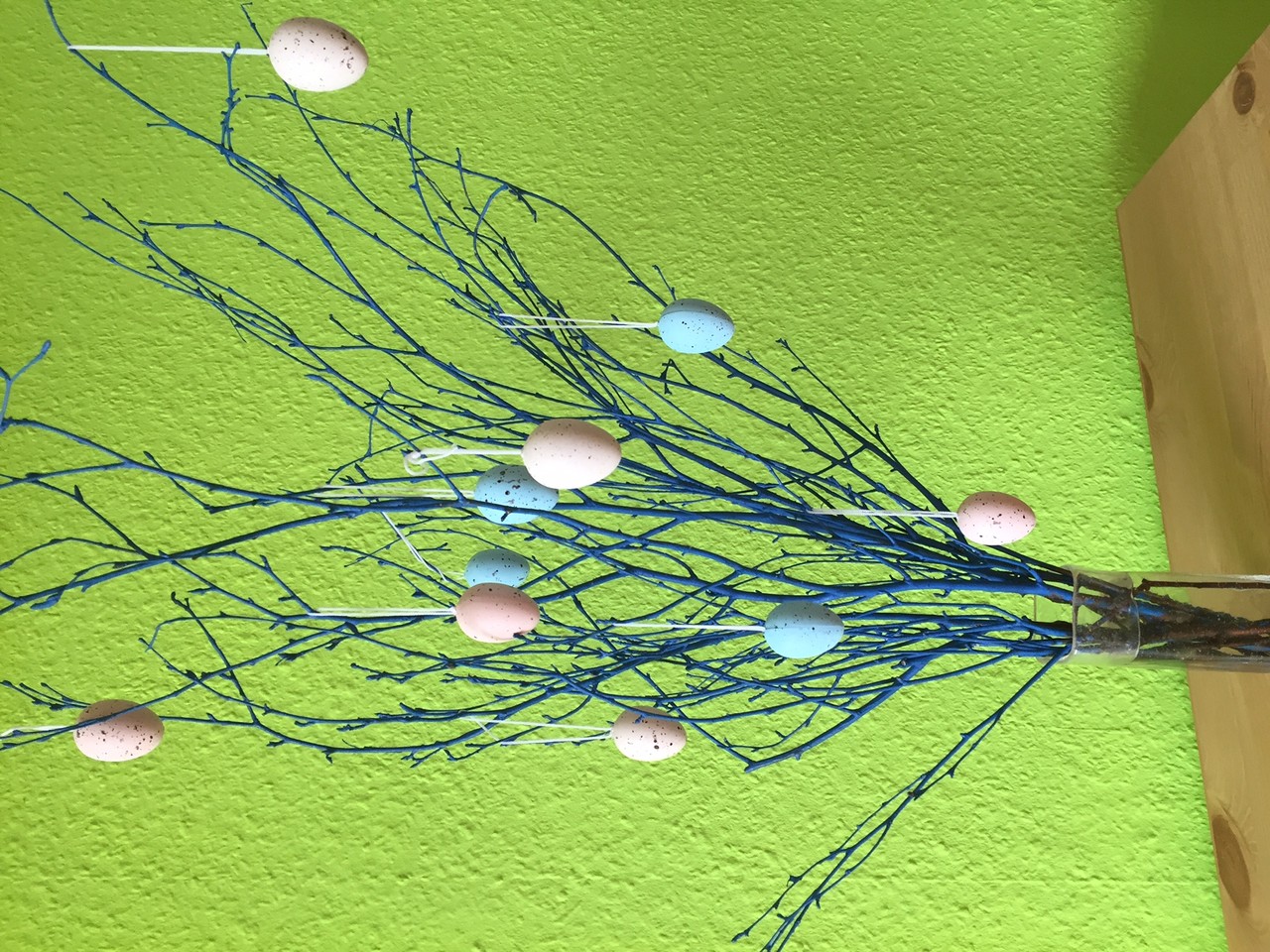 歩いていると、庭木にたまごのオブジェを飾っているお宅をたくさん見かけます。(たまごのオブジェは雑貨屋にたくさん売ってます)残念ながら、我が家には庭はないのですが、花屋さんで枝木を買ってきて今年はたまごツリーにトライ!