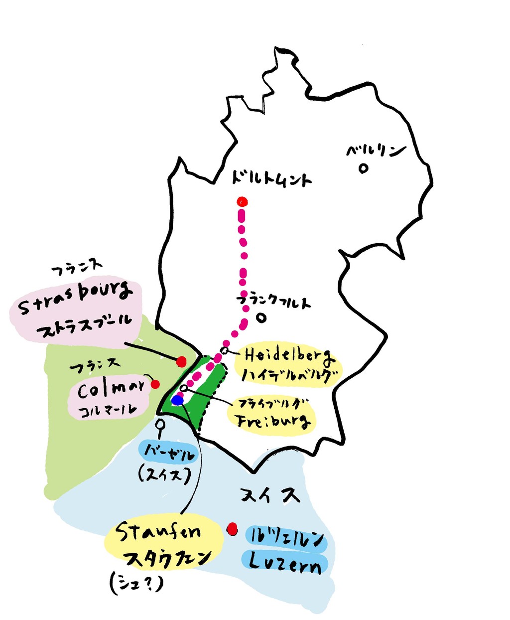 今回はSchwarzwald(黒い森と呼ばれる地帯(緑色で塗っている場所です))のStaufen(シュタウフェン)という街に泊まりながらフランスのStrasbourg(ストラスブール)やColmal(コルマール)、そしてスイスにも足を伸ばして旅行を楽しむ予定。