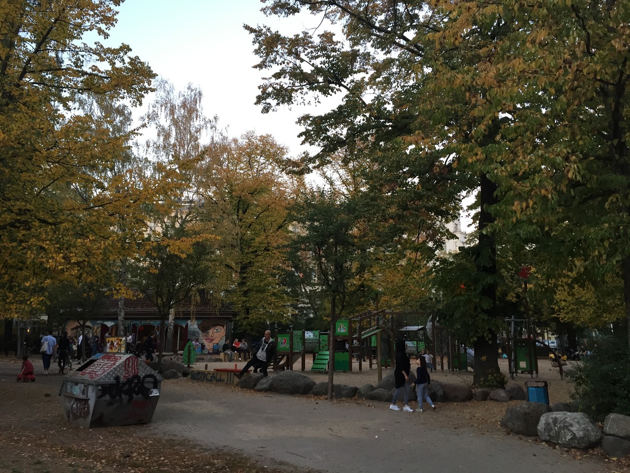 建物の落書きの多さにちょっと都会の怖さ?みたいなものを感じてしまいますが、公園は多くの子供で賑わい、とてもピースフルな雰囲気。ドルトムントでは、大きな庭のある家庭が多いからか公園では遊んでいる子供があまりおらず、ベルリンから引っ越してきた次男ワタと一緒だった幼稚園のママは、「どうしてこんなに公園で子供が遊んでいないの!?」と驚いていましたが、この光景を見て納得。そんな点でも都会を感じます。